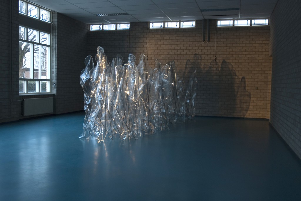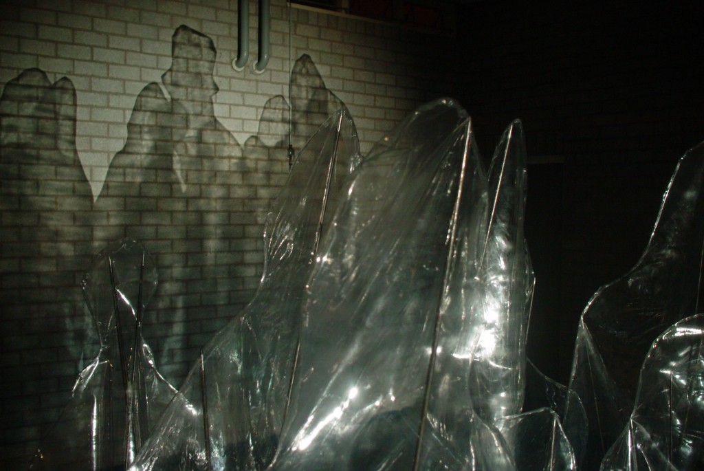 The Crowd 700x350 cm 36 human profiles on spears. transparent pvc , steel and theater light. 2010